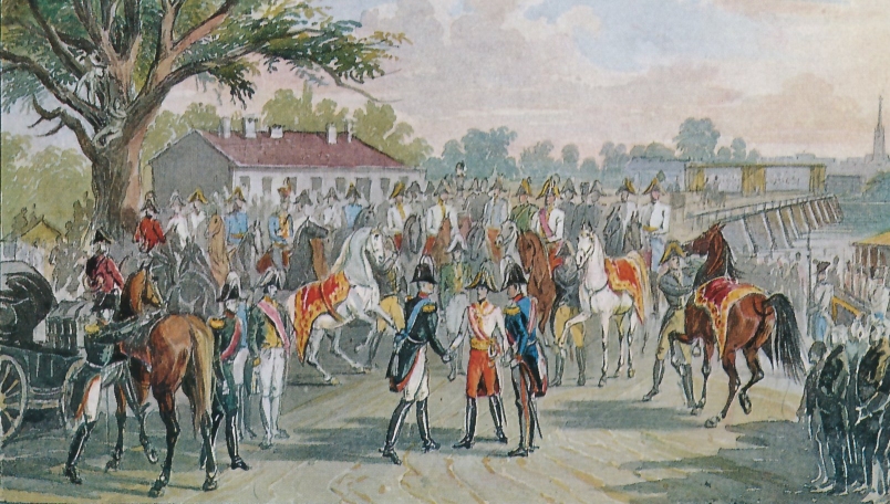 Der Einzug der drei Monarchen: Kaiser Franz I. von Österreich begrüßt Zar Alexander I. von Russland und König Friedrich Wilhelm III. von Preußen an der Taborbrücke. Aquarell von Johann Nepomuk Hoechle, 1833, Standort: Albertina Wien.