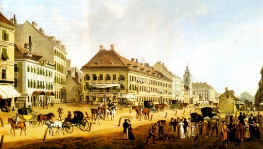 Die Jägerzeile (seit 1862 Praterstraße). Über diese ritten die drei Monarchen am 25. September 1814 unter den Augen von 100.000 Schaulustigen in die Hofburg ein. Gemälde von Franz Scheyerer, 1824.